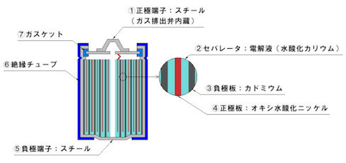 電解液を含浸させたセパレータ②で仕切られた正極板④及び負極板③がロール状又は積層構造にされ、正極及板び負極板をそれぞれ正極端子①、負極端子⑤に接続した状態でスチール製のケースに収められ、その外側を絶縁チューブ⑥が覆っています。